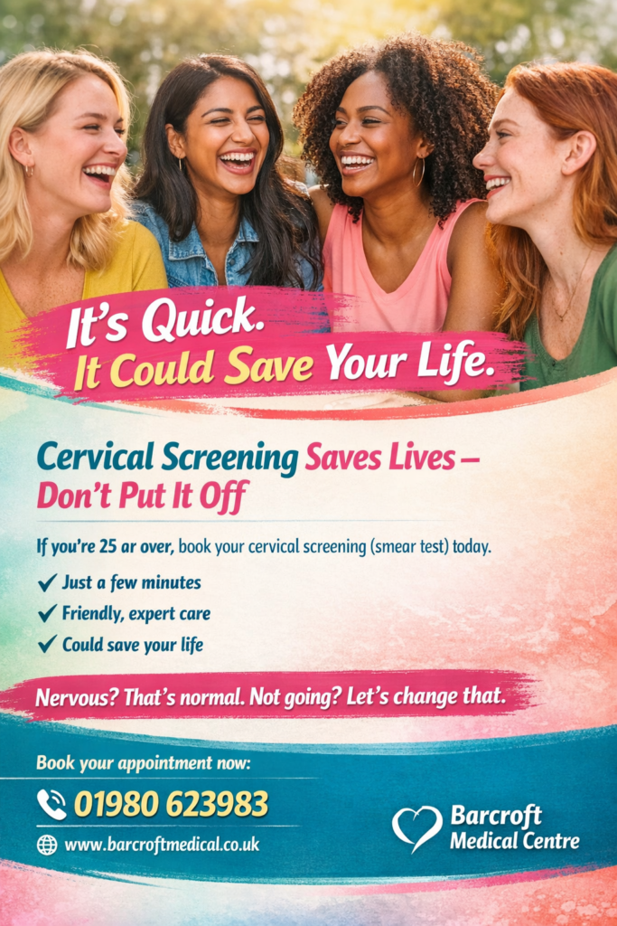 Additional text encourages people aged 25 or over to book a smear test, followed by bullet points highlighting that it takes only a few minutes, offers friendly expert care, and could save lives. A reassurance message reads “Nervous? That’s normal. Not going? Let’s change that.” Contact details for Barcroft Medical Centre are shown at the bottom.